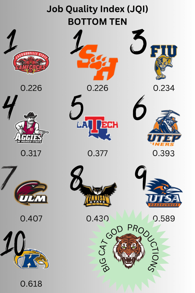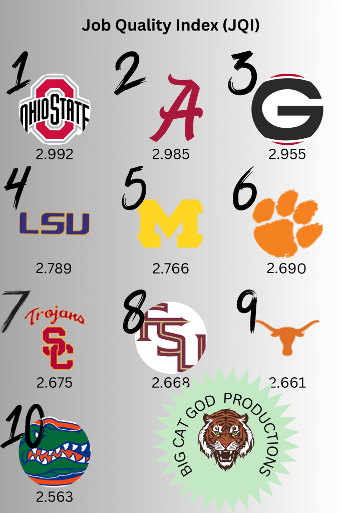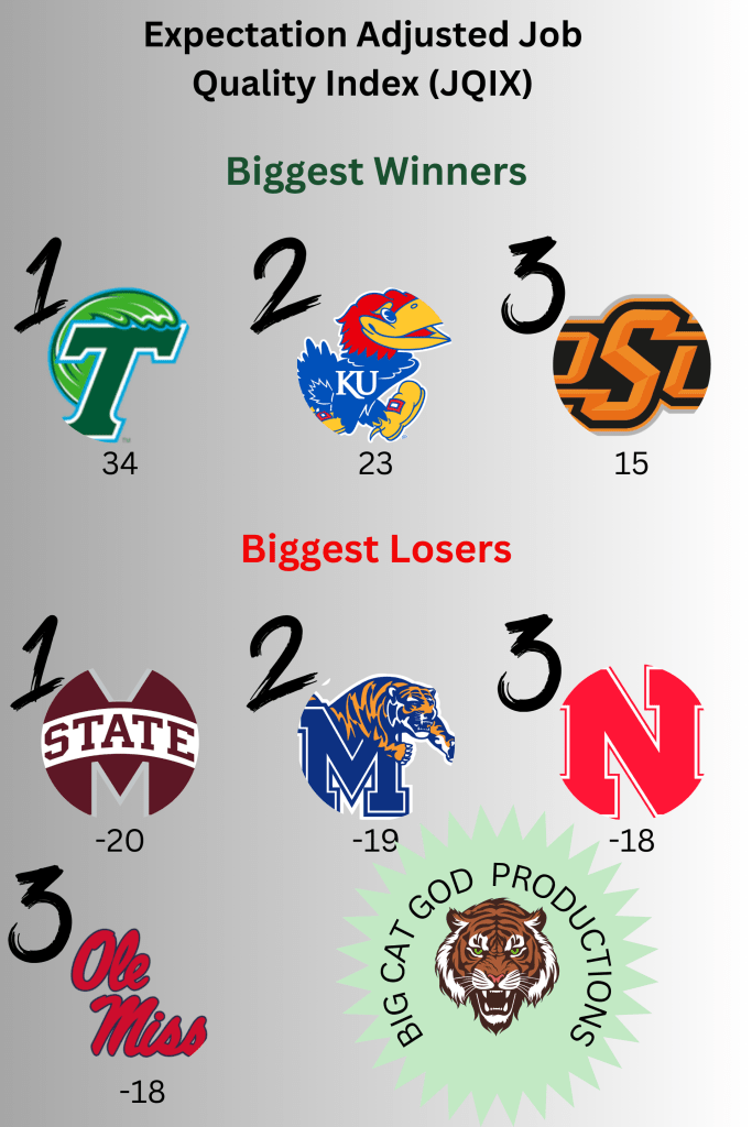 The metric thinks that Nebraska and Ole Miss are the exact same. They are tied in JQI (2.035, ranked at 32). They are also have similarly wild expectations which drops them both in JQIX (1.835, ranked at 50). This makes the jobs go from better than Tulane (72) and Kansas (62) in JQI and worse than Tulane (38) and Kansas (39).
