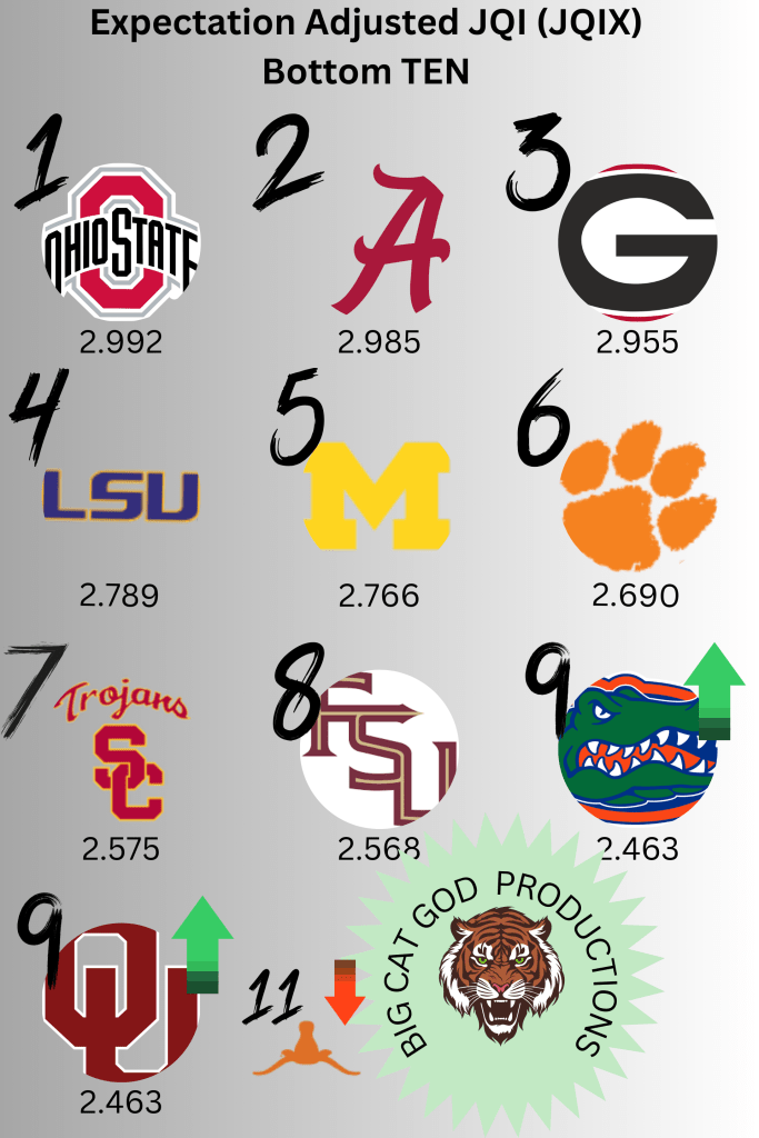 At the top thing don’t really change! It makes sense, if you have a championship program, you also have championship expectations. That’s where Texas falls, it expects Championships but the PP is only High. Oklahoma comes up to 9 and ties Florida. That is not to say that its PP is better than Texas (it is not), but the expectation of only Very High catches them up. The JQIX is actually 2.463 for OU and 2.461 for Texas aka same job really.