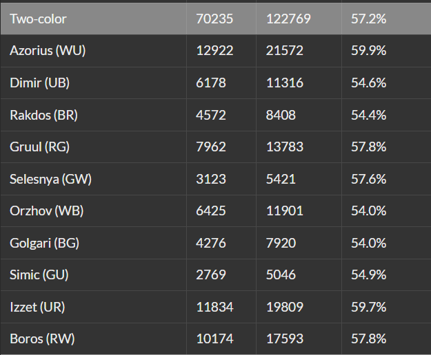 The best data, you will find is probably at 17lands.com. Let’s look at their color winrates: