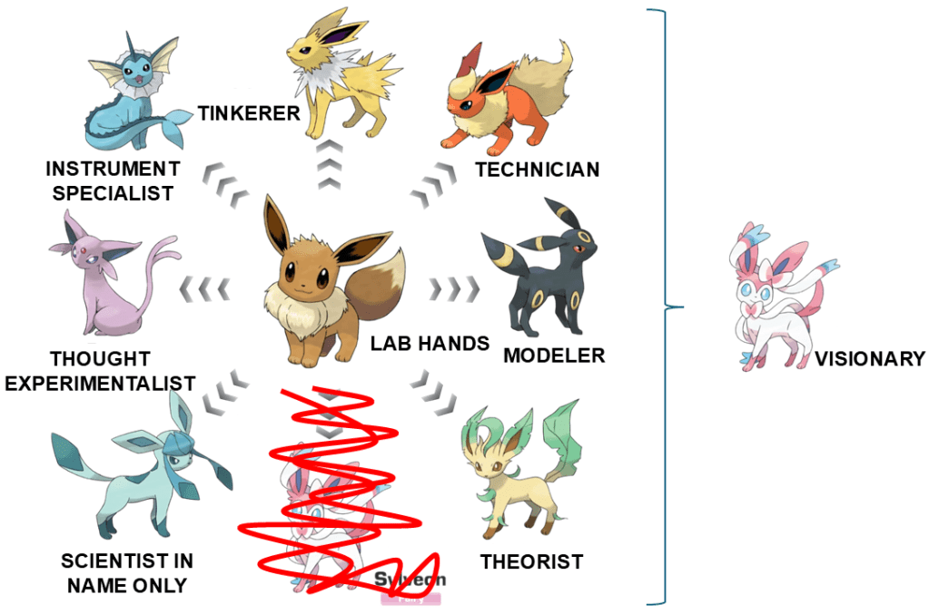 Much like Pokemon, scientists evolve and develop. There’s no right or wrong in any of these1. For those that don’t know. Pokemon usually start as babies evolve to a mediocre “adult” and some become advanced forms – the final evolution. Rarely with the help of shenanigans, they can become some bullshit like MEGA Pokemon. However, the best Pokemon for this analogy is Eevee. Eevee evolves into multiple forms depending on what you want.